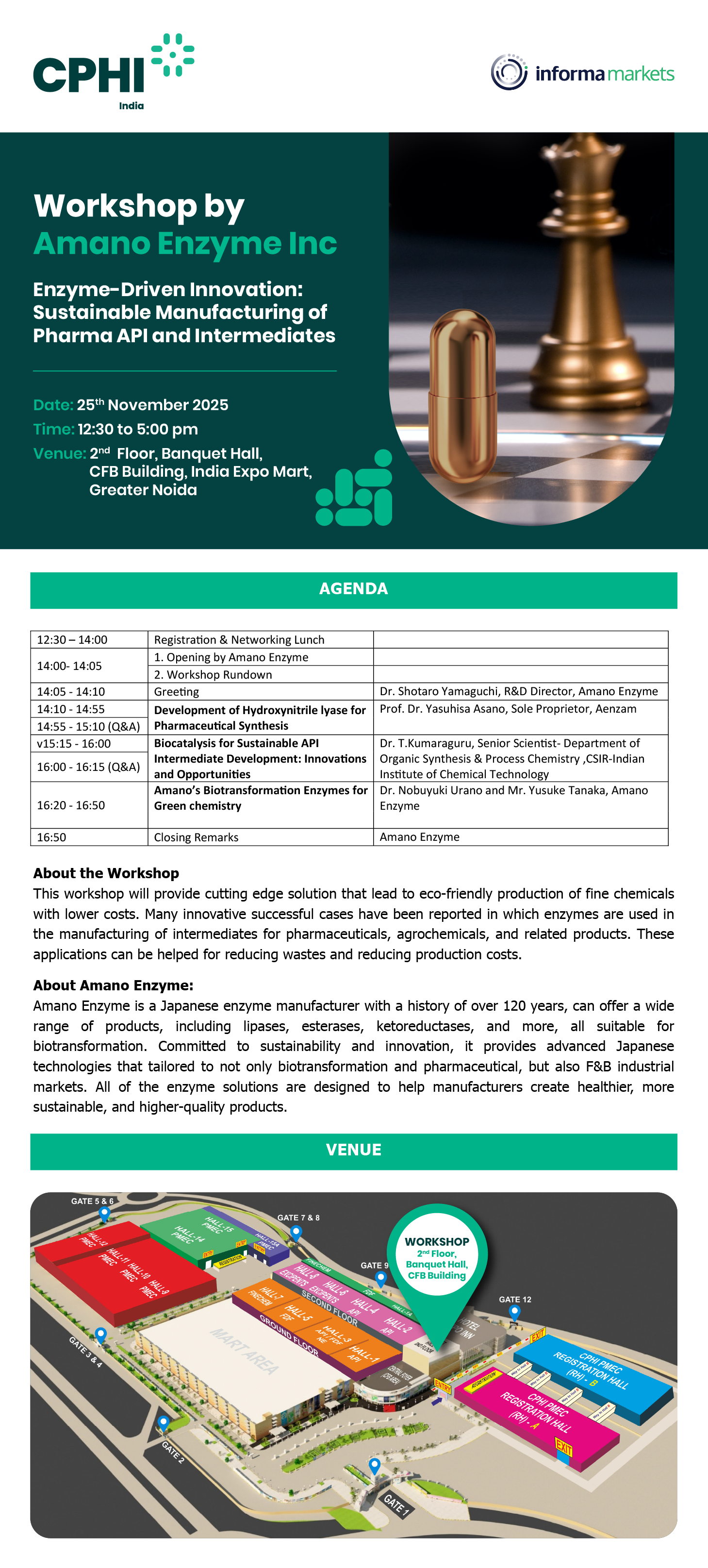 This workshop will provide cutting edge solution that lead to the eco-friendly production of fine chemicals with lower costs. Many innovative successful cases have been reported in which enzymes are used in the manufacturing of intermediates for pharmaceuticals, agrochemicals, and related products. These applications can be helped for reducing wastes and reducing production costs.